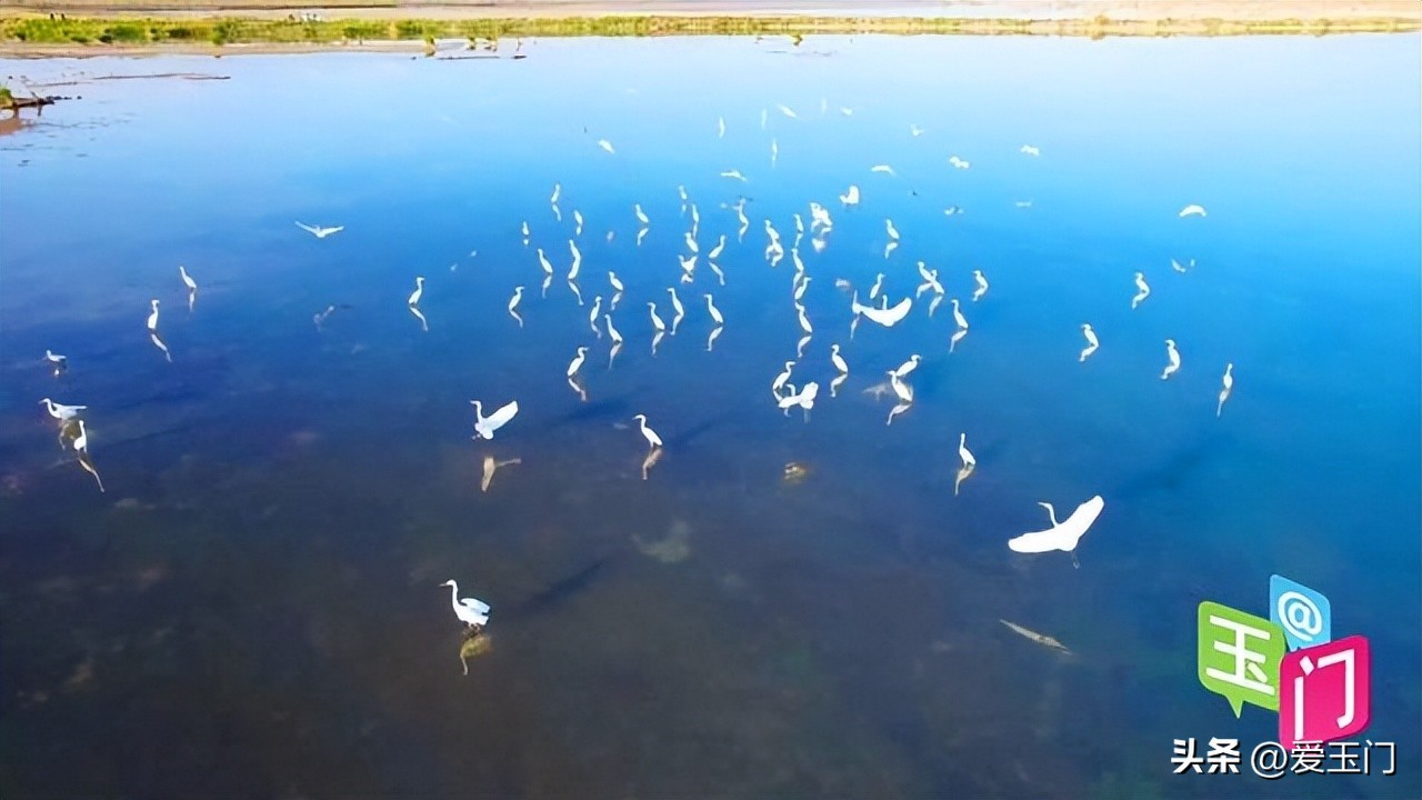 玉门融媒记者 安成玲:“粼粼一水间,水上飞白鹭,沿着疏勒河一路向下,现在我们就来到了由疏勒河水滋养的一片湿地青山水库。这里也被誉为玉门的马尔代夫。夕阳西下,整个水面波光粼粼,丰美的水草透过夕阳散发着金色的光芒,一行行白鹭随风而起,这个景色简直不要太美。尤其到了秋天,这里有鱼还有蟹,成为了众多小伙伴们的打卡地。”
