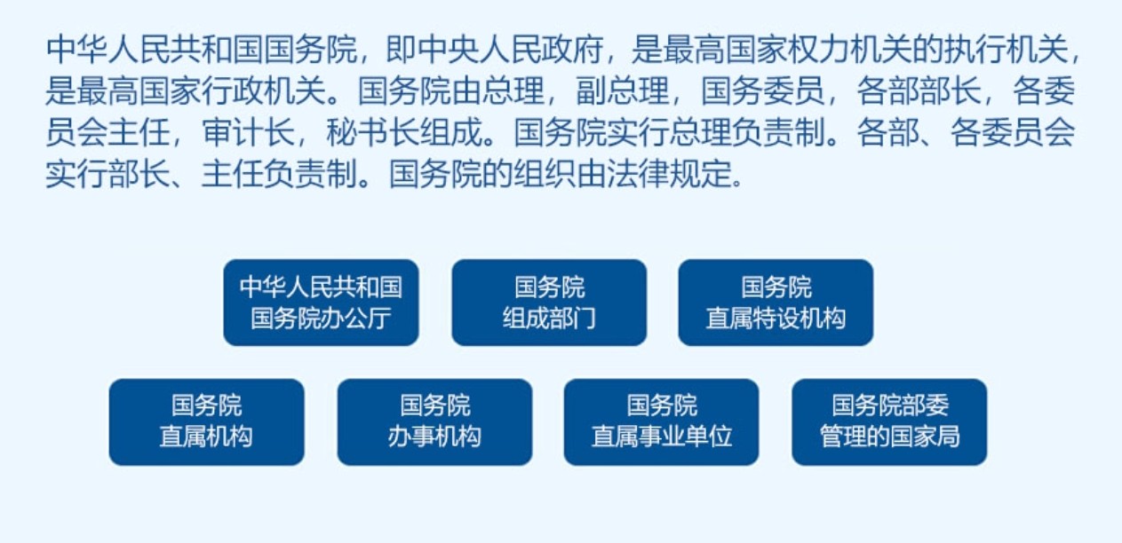 我国的国务院,也即是中央人民政府,是我国最高国家权力机关的执行机关,是最高国家行政机关。国务院由总理,副总理,国务委员,各部部长,各委员会主任,审计长和秘书长组成,国务院实行总理负责制。各部、各委员会实行部长、主任负责制。国务院除了组成部门,还有办公厅,直属特设机构,直属机构,办事机构,直属事业单位,国务院管理的国家局等机构。
