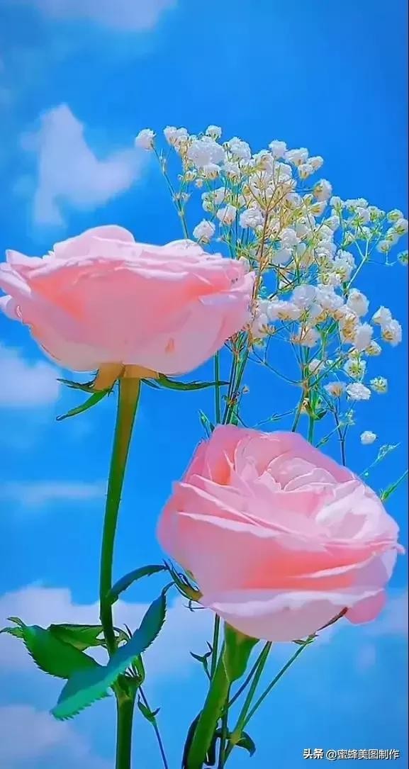 粉色玫瑰花随风摇曳生姿,还有白色小满天星伴舞,还有蓝天白云飘飘,这画面太美好了……