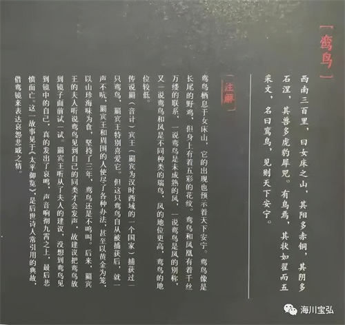 《大荒西经》记载:“鸾鸟自歌,凤鸟自舞。”“五彩鸟三名,一曰皇鸟,一曰鸾鸟,一曰凤鸟;《广雅》记载:鸾鸟,凤皇属也;《国语·周语》记载:“周之兴也,鸑鷟于岐山”。