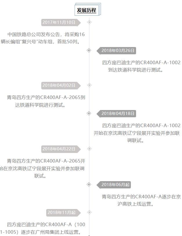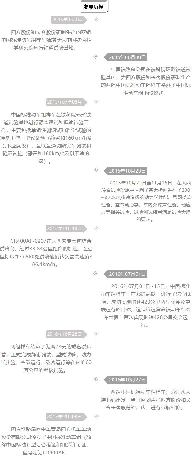 2012年开始启动相关工作;2013年6月“中国标准”动车组项目正式启动;2013年12月总体技术条件制定完成;2014年9月方案设计完成(外观由英国PriestmanGoode公司设计);2015年6月30日,CR400AF首组样车下线。