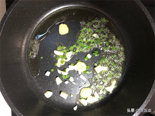 2、起锅烧油,油热后把葱花、姜片以及蒜末下入锅内煸炒出香味。