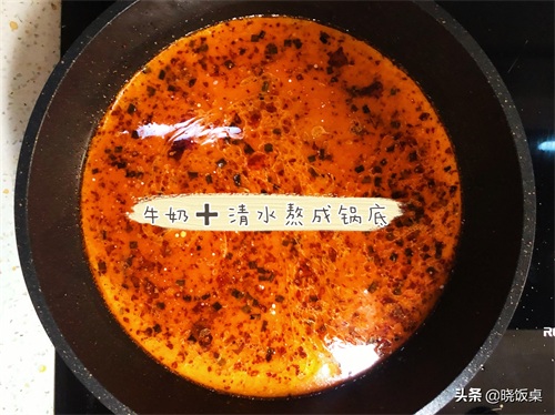 4、等豆瓣酱和火锅底料炒好后,在锅中倒入牛奶和适量的清水并熬成麻辣烫的锅底。