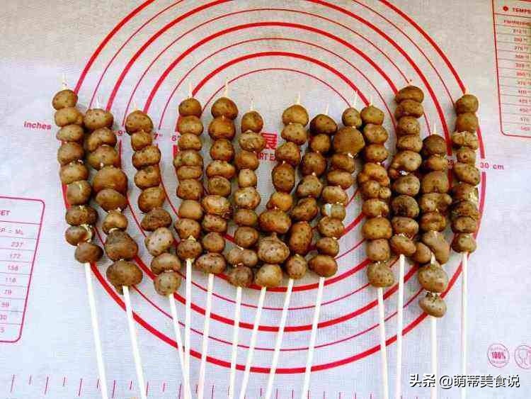 2. 准备好竹签子,可以稍微短一些,也可以稍微长一些,将山药豆串在上面,摆放好了一串一串的,是不是有点卖山药豆糖葫芦的感觉了。这还不是最后的步骤,接下来是熬糖的环节,这个提醒大家在做的时候一定要注意安全,避免烫伤。