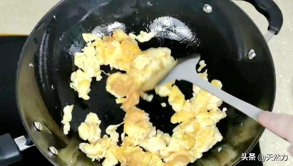 热锅下油,先炸鸡蛋,炸鸡蛋比较耗油,下平时炒菜2-3倍的油,油温7成热倒入蛋液,用铲子打散翻炒,等鸡蛋两面金黄就可以起锅备用。