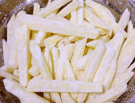 3、炸薯条,复炸是非常关键的,先用中火炸一会,再用高温大火复炸一遍,薯条特别好吃,如果煮的土豆条比较多,可以将其粘裹淀粉后放入冰箱冷冻保存,想吃随手拿出下锅一炸便可。