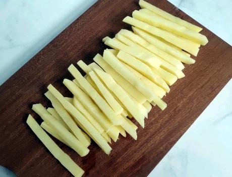 制作过程:第一步,土豆3个,分别削去皮,清洗干净,将土豆切成均匀的条状,土豆条放入在清水中浸泡5分钟;