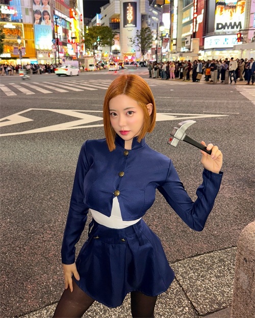 先说去年底闪现日本街头,直接满足粉丝们的愿望 cos 一波《咒术回战》的钉崎野蔷薇。