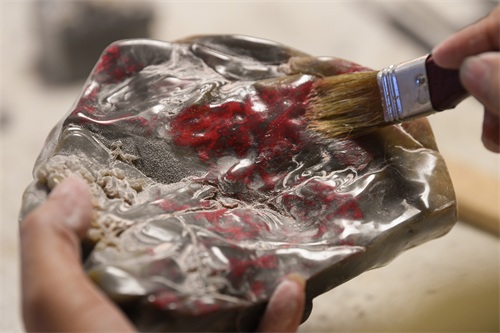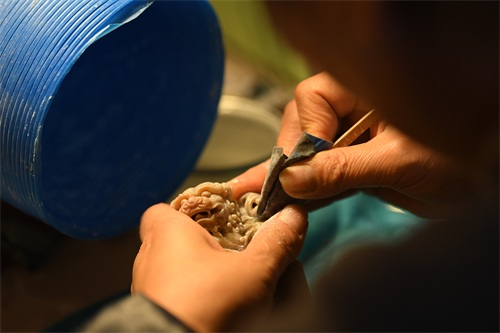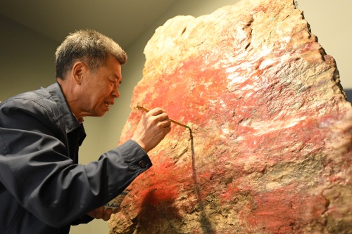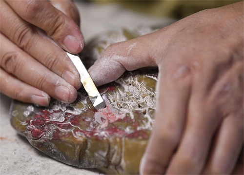 ↑中国工艺美术大师钱高潮在工作室加工一件鸡血石雕作品(11月5日摄)。