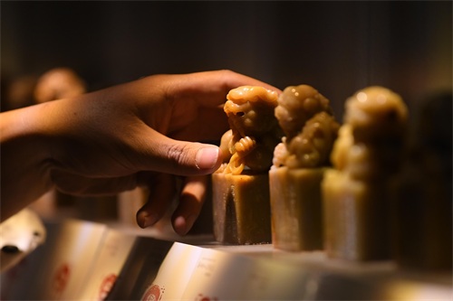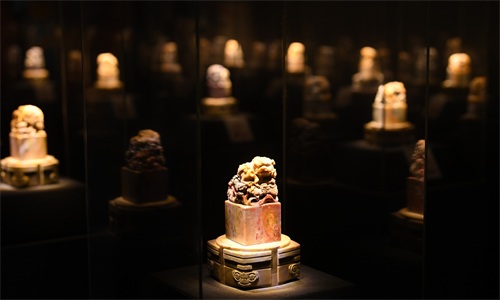 ↑在中国工艺美术大师钱高潮工作室展示的他用昌化石创作的作为G20杭州峰会礼品的印章复制品(11月5日摄)。