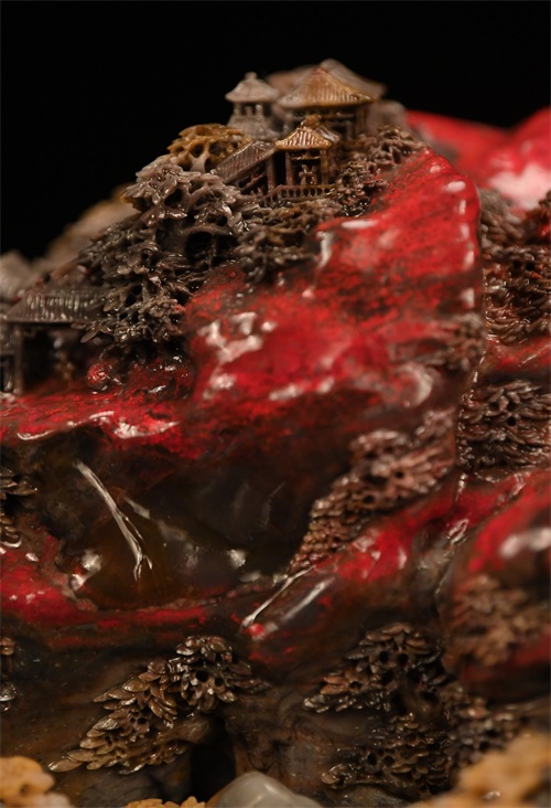 ↑中国工艺美术大师钱高潮创作的鸡血石雕刻工艺品《鸿运山庄》局部(11月5日摄)。