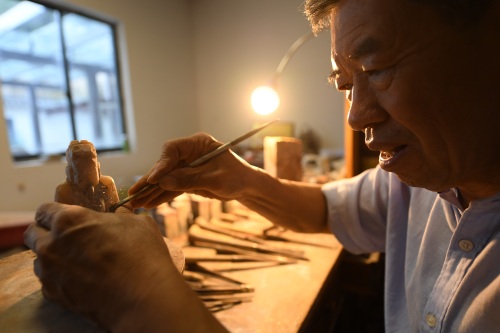 ↑中国工艺美术大师钱高潮在工作室进行石雕创作(11月5日摄)。