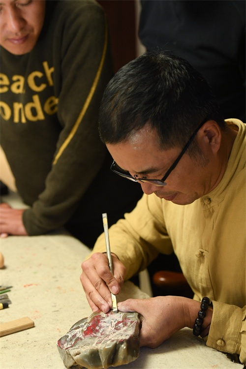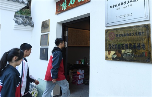 ↑昌化职业高级中学石雕班学生来到昌化鸡血石雕传承基地学习(11月5日摄)。