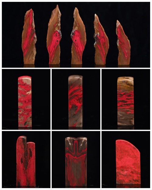 ↑中国昌化鸡血石博物馆馆藏的鸡血石印章(拼版照片,11月5日摄)。