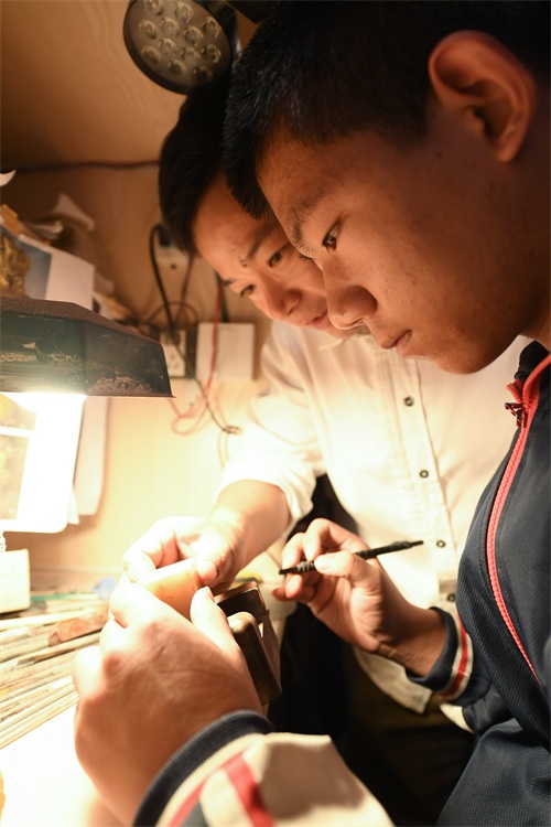 ↑浙江省工艺美术大师钱友杰(后)在工作室向前来学习的昌化职业高级中学石雕班学生传授雕刻技艺(11月5日摄)。