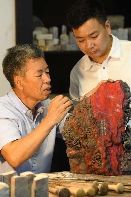 ↑中国工艺美术大师钱高潮(左)和儿子钱友杰在工作室加工一件鸡血石雕作品(11月5日摄)。