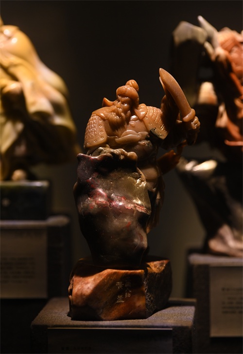 ↑在中国工艺美术大师钱高潮工作室展示的他用鸡血石创作的“三国”人物黄盖(11月5日摄)。