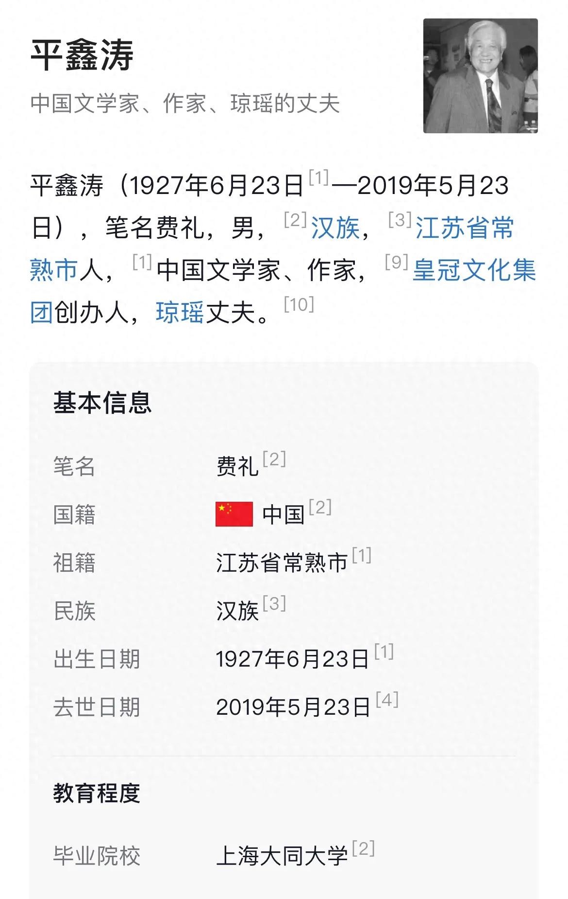 平鑫涛(1943年-2021年),是台湾著名的商人,广为人知的“华视”前董事长,同时也是台湾媒体界和商界的重要人物。他与琼瑶的关系颇为特殊,曾是琼瑶的丈夫,且两人有着深厚的感情纠葛。