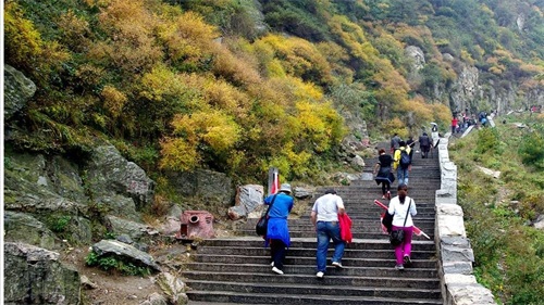 泰山十八盘是泰山登山盘路中最险要的一段,共有石阶1600余级,为泰山的主要标志之一。此处两山崖壁如削,陡峭的盘路镶嵌其中,恰似天门云梯。十八盘之尽头便是名声显赫的南天门,山于此为最危耸,是飞龙岩与翔凤岭之间的低坳处,双峰夹峙,如天门自开,有“门辟九霄仰步三天胜迹,阶崇万级俯临千嶂奇观"的意境。