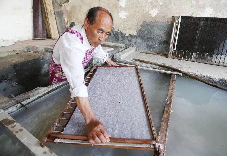 经过多次漂洗、碾压的纸浆要想成形,还需到屋里的涵池里历练一番。一池的纸浆,他们要千百次的依照同样的频率搅动,一搅就要持续一整天。而纸,就是从这纸浆里捞出来的。手工纸的抄捞工艺,对麻纸工匠的塑纸要求最为严格。拍浪,纸浆翻动的瞬间,迎浪下帘、荡帘,轻荡则薄,重荡则厚,厚薄之间完全在于工匠手上的功夫。任何一个环节稍有差池,便会前功尽弃。
