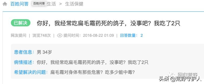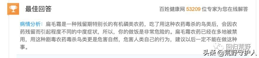 上图是淘宝一个购买来扁毛霜购买者在商品下方的评价。类似的,很多人用扁毛霜来毒鸟,毒死的鸟用来来自己吃或者卖给野味店,类似的行为一旦出事遍是害人害己。