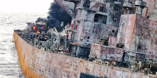 目前海上只有 " 桑吉 " 轮的残留物和残油在燃烧,且形成了 10 平方公里的油污带,溢油情况非常严重。