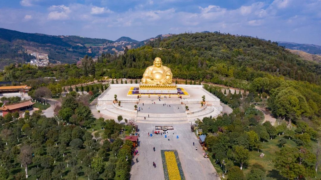 在云南省弥勒市的锦屏山顶,有一尊现今世界上最大的弥勒坐佛,其造型壮观夺目。整尊弥勒佛由水泥钢筋铸成,外层镀24K金,在阳光下金光闪闪。