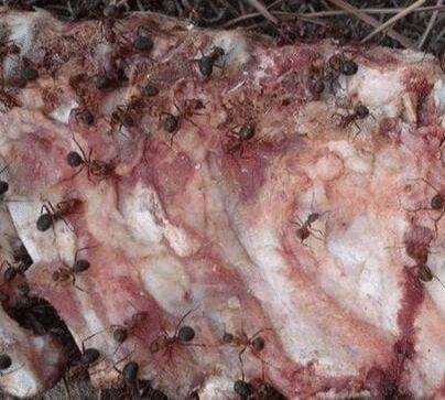 在丛林的地面,铺满了厚厚的一层黑褐色食人蚁,黑压压一片,望不到尽头。当时根本来不及看清这种蚂蚁的大小和形状,食人蚁群以大家来不及反应的速度,潮水般向前推进,推进,一下只有七八米远。转眼间,蚁群铺天盖地地爬满人们全身,在一声又一声凄厉的尖叫声中,跌倒在食人蚁群里,迅即被蚁群淹没了。就连大象,狮子,老虎一类的大型动物,如果躲避不及,也会分分钟内被吃掉!