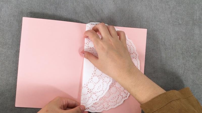 13、将蛋糕托沿着贺卡中间的夹痕翻折
