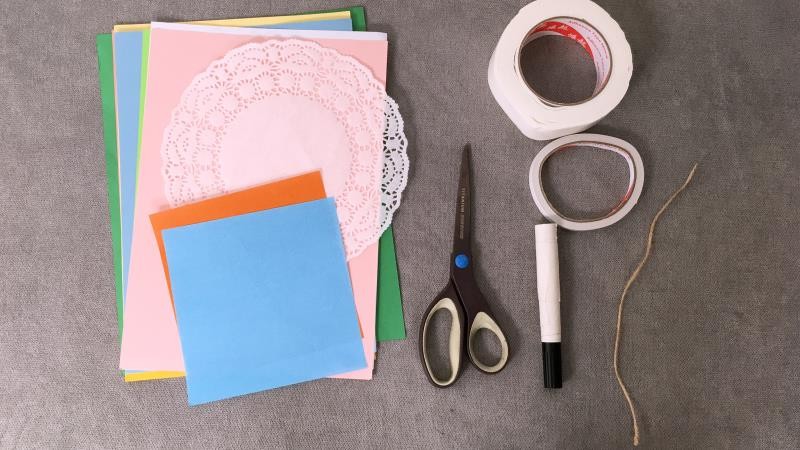 剪 刀 / 记 号 笔 / 蛋 糕 托 / 卡 纸 / 双 面 胶 / 海 绵 胶 / 麻 绳