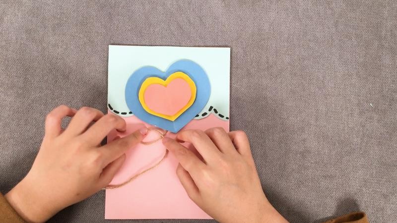 8、将麻绳粘贴在爱心背后,绕个弯
