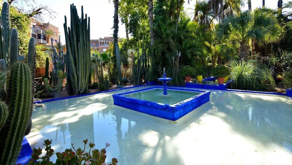 说到马拉喀什,其位于阿特拉斯山脉的后方,环境十分干旱,水成为一种神圣的奢侈品。摩洛哥的每个村庄都以伊斯兰教祈祷前用的沐浴泉水为中心,而伊夫圣罗兰花园里的大理石池塘体现了这一传统。除了上文提到的种类惊人的仙人掌外,园中还有各种各样的香蕉树、九重葛、竹子、椰子树和睡莲。夜莺、黑鸟和斑鸠等多种鸟类都在这里筑家建巢,鸟鸣声成为了自然的背景旋律。