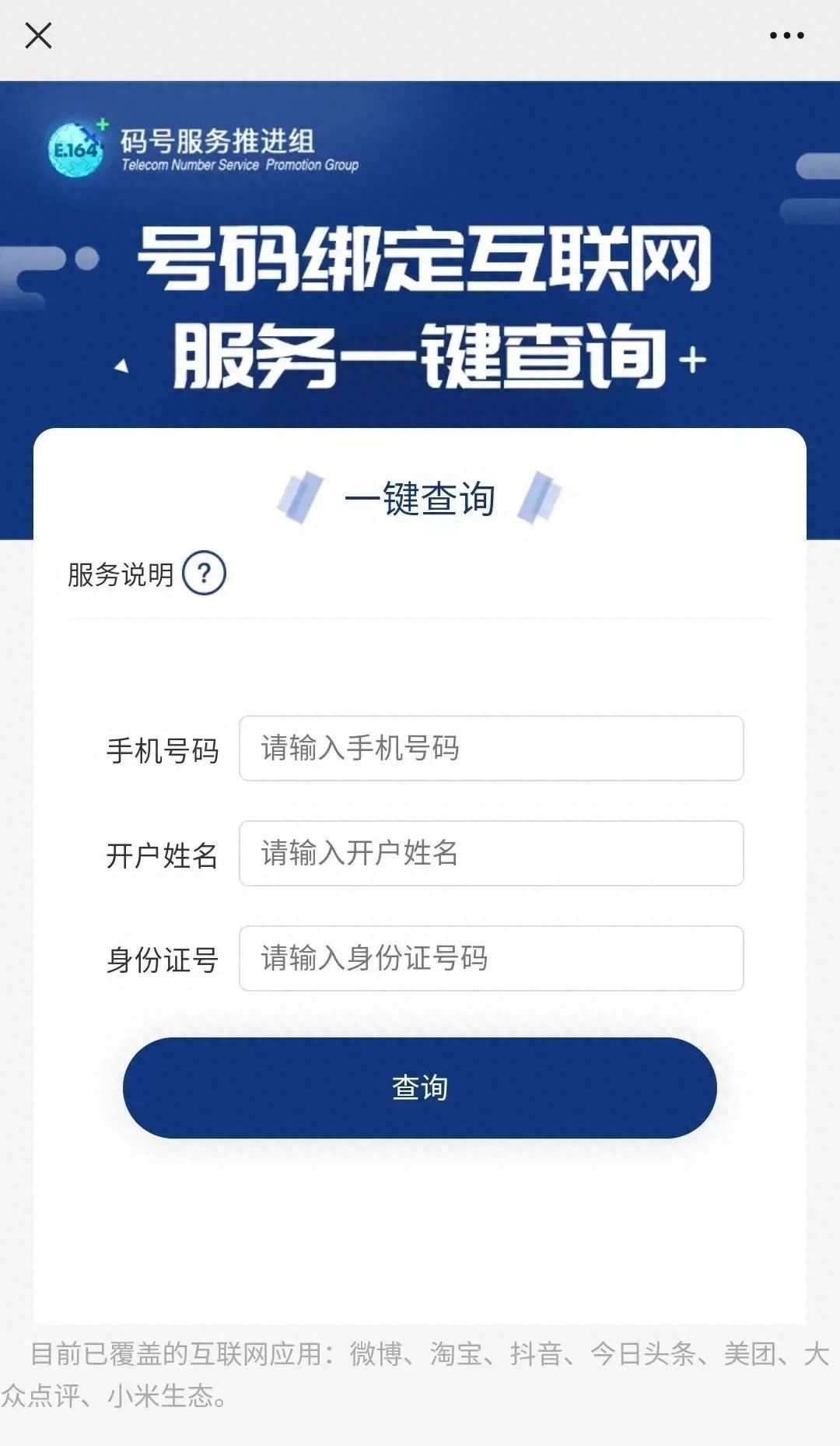 声明还特别指出中国电信、中国移动、中国联通在网手机用户(不含2021年前携号转入用户)可申请使用本服务本服务覆盖的互联应用范围是微博、淘宝、抖音、今日头条、美团、大众点评、小米生态等具体以申请页面为准据了解,中国信通院近年来已提供了多项针对手机号的公共服务,包括在疫情防控中广泛使用的通信大数据行程卡(行程码),以及查询名下电话卡数量的全国移动电话卡“一证通查”服务等。