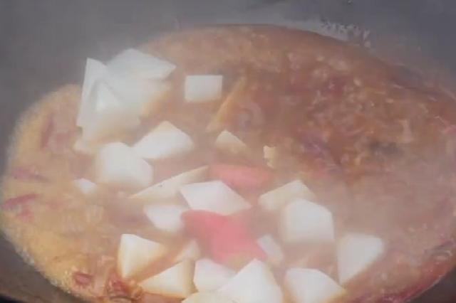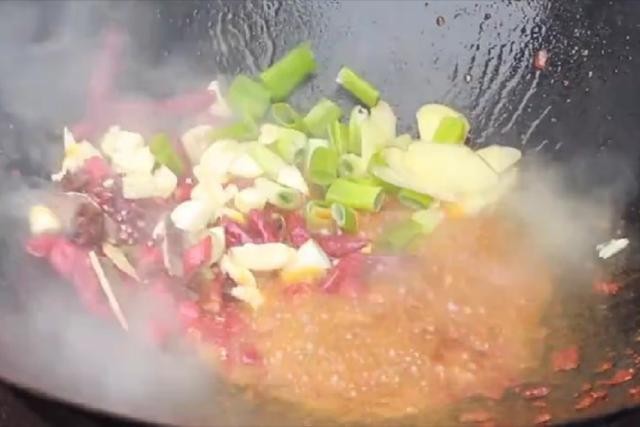 1、烧锅下入150克清油、油温六成热下入50克豆瓣酱炒出红油,下入姜片、蒜、大葱、八角、香叶、桂皮、花椒、泡红椒。