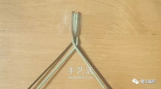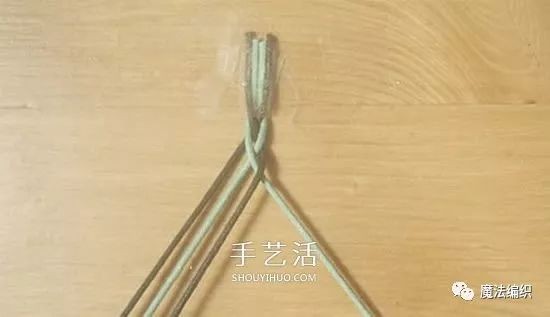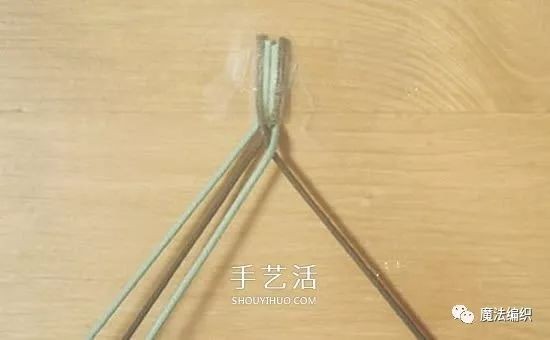 用透明胶把四股绳固定在桌面上。