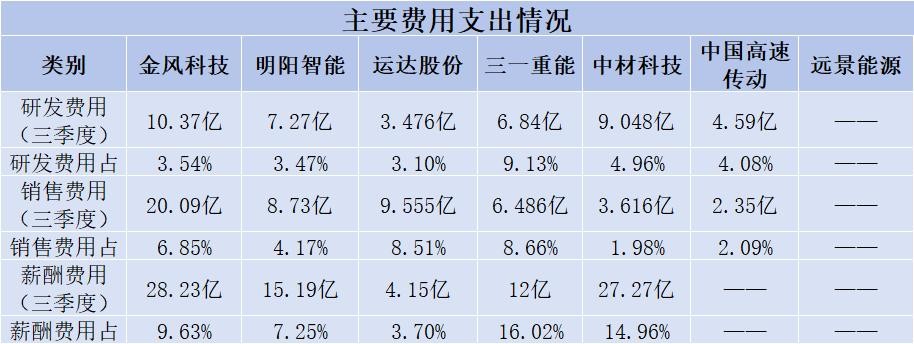 研发费率最高的是三一重能,高达9.13%,薪酬费率最高的是三一重能,高达16.02%,销售费率最高的是三一重能,高达8.66%。