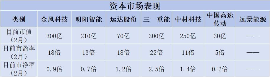 截至2月份,市值最高的金风科技和三一重能,高达300亿元,市盈率最高的是三一重能,高达22倍。