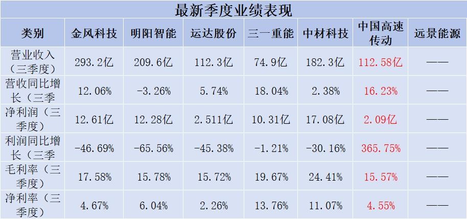 前三季度营收最高的是金风科技,高达293.2亿;营收增长率最高的是三一重能,高达18.04%。
