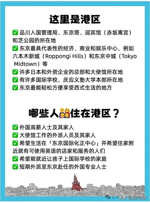 港区-东京23区中国际色彩蕞浓厚的行政区。驻日大使馆与外资企业的大量进驻,让本地的外国人居住者比例达一成之多。