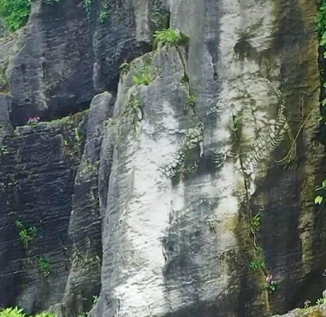 而真正,令人惊奇的是喀斯特公园岩石绝壁上的两只生物化石。关于这两只是什么生物的化石,网上是众说纷纭 ,答案是千奇百怪。有说是恐龙,有说是蝎子,甚至还有说是蜈蚣。