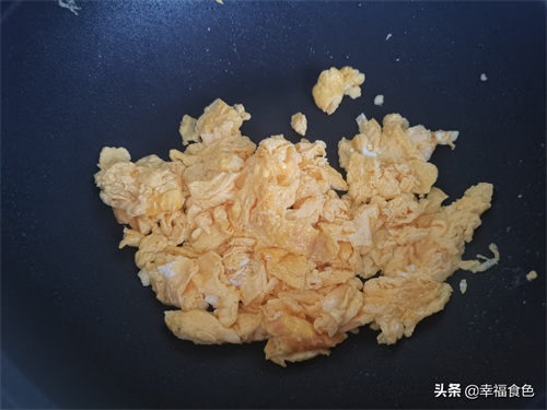 5、中小火煎至定型后滑散,盛出来备用,不要炒太久了,炒干水分鸡蛋就不嫩了。