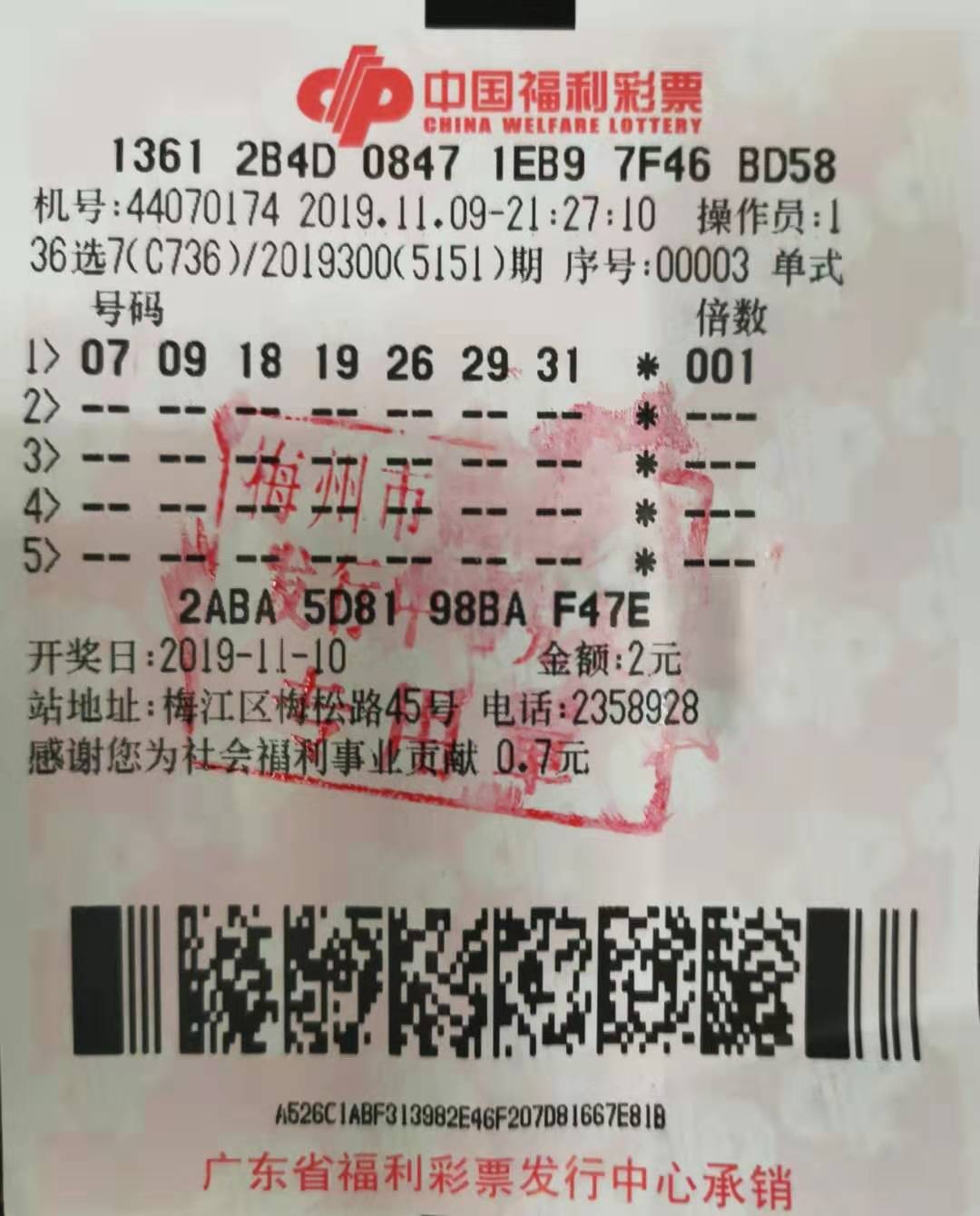 11月10日晚,中国福利彩票36选7第2019300期开奖。据悉,当期全省仅中出一注一等奖,花落梅州市。