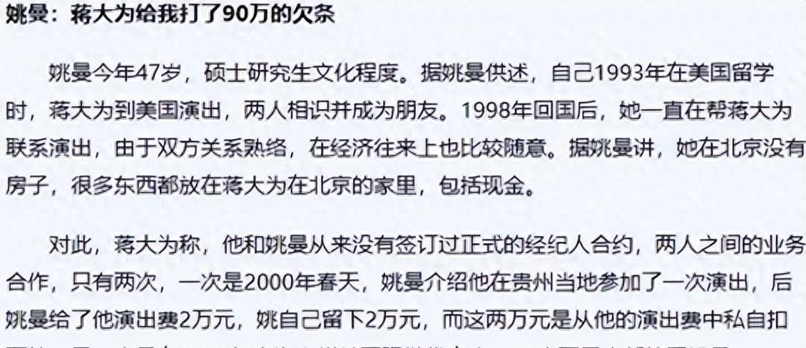 姚曼因此入狱五年。蒋大为在这场风波中没有遭受到金钱上的损失,但他的声誉受到了严重打击,演出机会也逐渐减少。他曾经是一代艺术家,但现在,他很少出现在公众视野中。