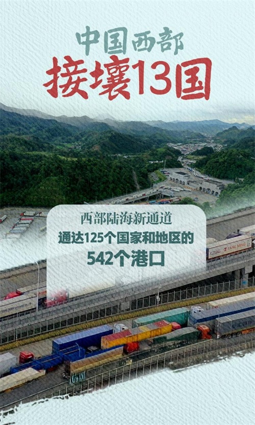 中国西部接壤13国,是中国向西、向北和向南亚、东南亚国家开放的门户地区。作为共建“一带一路”标志性项目,西部陆海新通道联通东西、纵贯南北,货物经铁路、海运、公路等,向南经广西出海,通达125个国家和地区的542个港口。