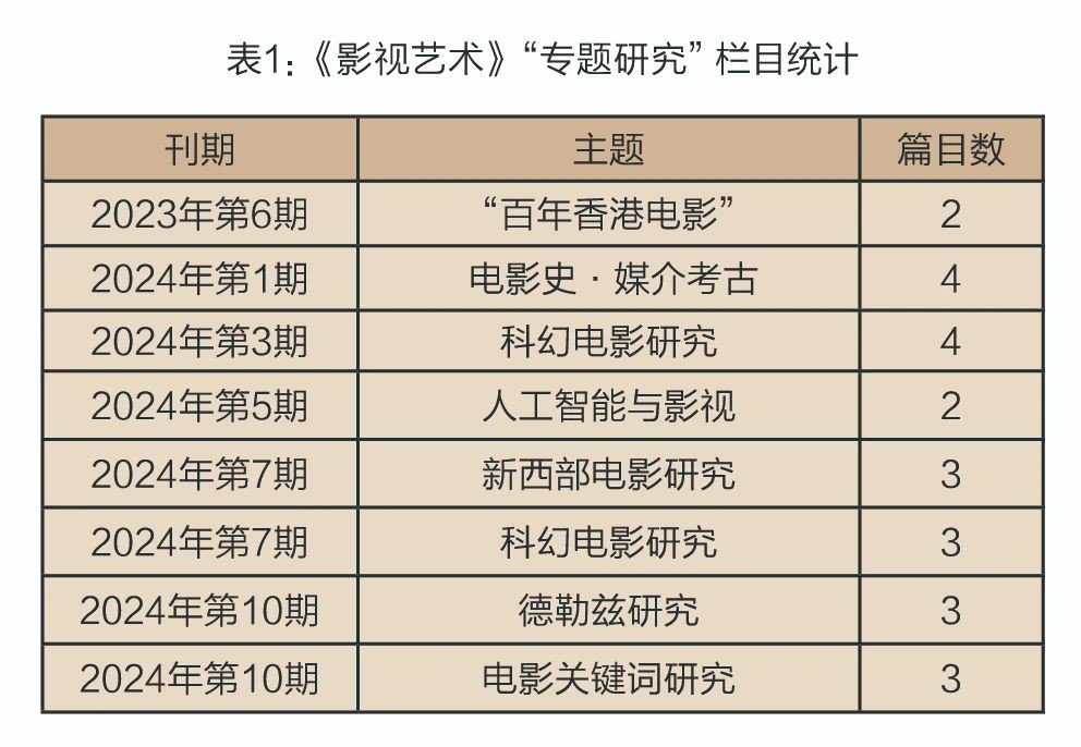如表1所示,“专题研究”栏目展现了对几个核心主题的深入关注。首先,栏目聚焦于电影史与地域文化研究,如“百年香港电影”和“媒介考古”,探讨电影在不同历史背景和地域语境中的演变;其次,栏目涉及类型与概念研究,其中“科幻电影”多次成为重点,反映了这一类型在中国影视研究中的活跃态势;而“新西部电影”的阐释则反映出类型电影在本土语境中的独特演进。此外,哲学与技术的前沿理论在“专题研究”中同样占据重要位置,如“德勒兹研究”“人工智能研究”和“电影关键词”等主题,体现了中国影视学术在技术革新的背景下对影视理论的持续探索。