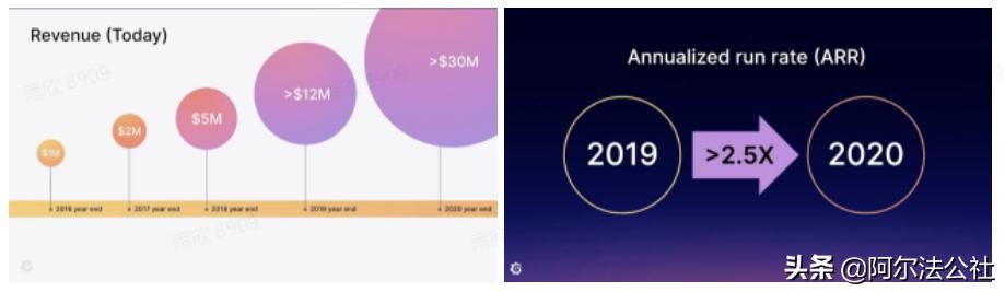 截至2020年底,公司的营收已经超过3000万美元,全部由Grafana Cloud上的1200多位用户贡献,ARR相较于2019年同期实现了2.5倍以上的增长。
