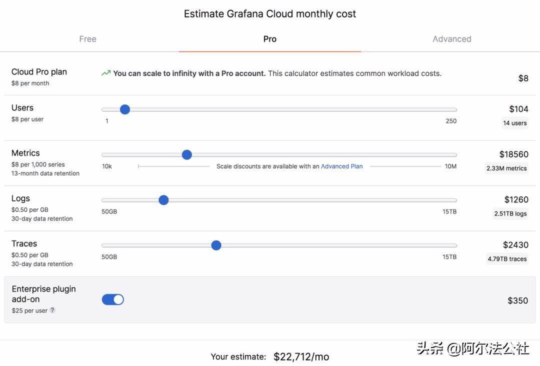 Grafana Cloud Pro采用基于使用量的定价模式( Usage-based Pricing Model),从使用人数到指标、日志、链路追踪的用量均可自主灵活配置。公司官网还提供模拟账单,用户配置过程中可以清楚了解价格变化情况。基于使用量的定价模式显然要更友好、更灵活。