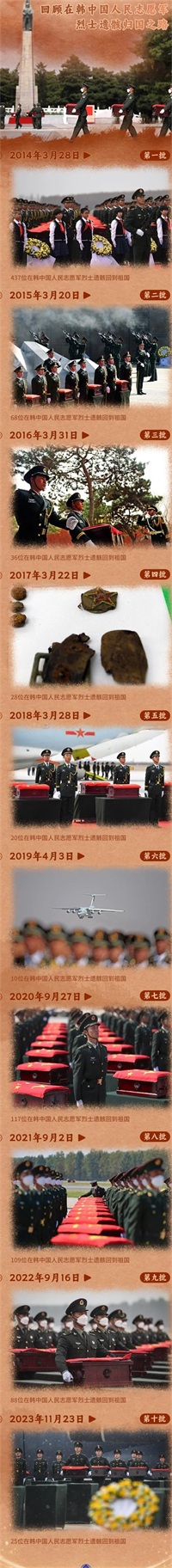 今天,109名志愿军烈士遗骸和1226件遗物已运回中国。中国人民解放军仪仗大队将以最高标准、最礼遇迎接归来的英雄们。此前,中韩两国在韩国举行了安葬第八批中国志愿军烈士遗骸仪式。