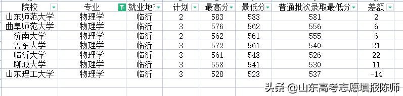 物理学专业,最低录取分数583-525,只有山东理工大学的录取分数低于正常录取的,其他都高,临沂大学、鲁东大学高出20多分,性价比太低。