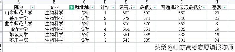 生物科学专业竞争够激烈,最低录取分数从602——535,6所院校全都高出正常录取分数,枣庄学院更夸张,高出34分。